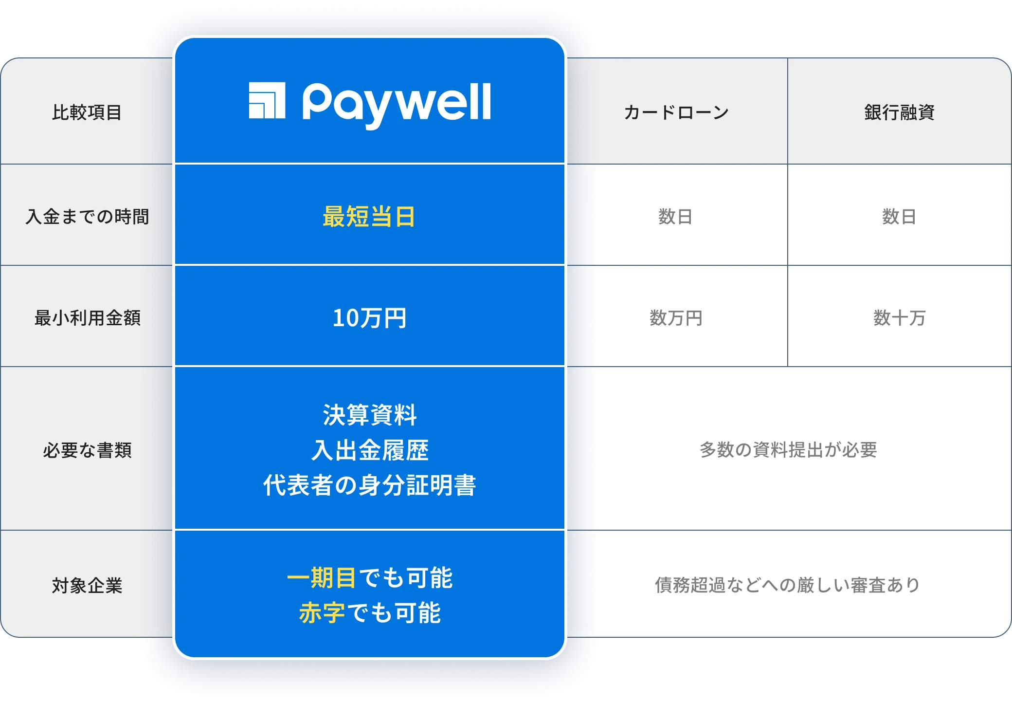 Paywellは、他のファクタリング企業や大手金融機関などに比べ、